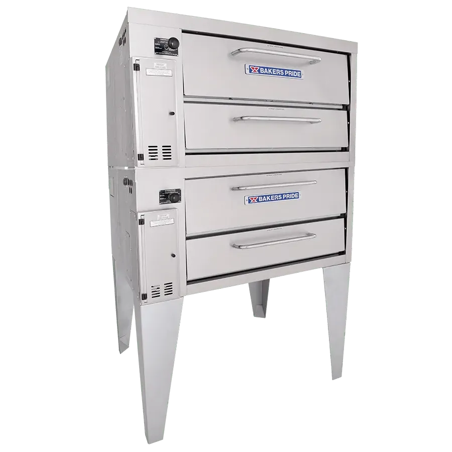 The Bakers PrideĀ® model 252 standard-depth double-stacked gas pizza oven is designed for all your high-volume baking needs. This double-stacked oven features two Cordierite decks with 8" deck heights and independently controlled top and bottom heat dampers for perfectly balanced results. This 48" wide model is constructed with heavy-duty angle iron frame, which is fully welded to allow for stacking. The oven exterior is heavy-duty stainless steel and fully insulated for cooler outer temperatures and consistent interior temperatures.